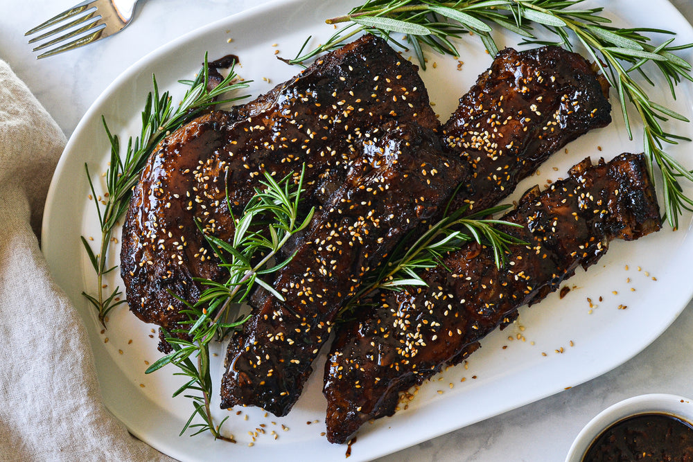 Remove the ribs from oven and carefully open the foil packet. Turn the broiler on High. Line the baking sheet with a fresh sheet of foil and transfer the ribs to this sheet. Using a brush, coat the ribs in additional sauce. Place the ribs under the broiler to brown and caramelize the ribs, about 3 minutes. Serve with fresh rice or a salad and top with sesame seeds.