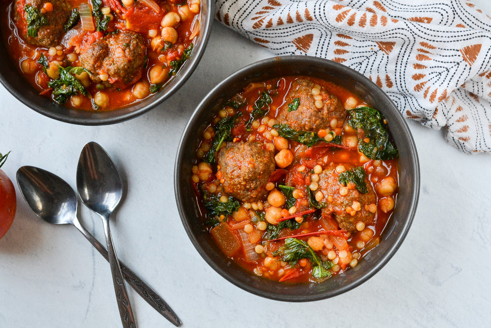 Our berbere meatball stew recipe uses our proprietary Piquant Post Berbere in two applications: once to season the meatballs, and once to season the stew itself. Cayenne pepper and fresh ground chilis pack a punch of heat upfront while enticing hints of cardamom, cinnamon and clove provide a warming, slightly sweet contrast. Tied together with bitter maple notes from fenugreek and aromatics from coriander and onion, our berbere deeply infuses your dish with flavor. The meatballs are par-cooked in the oven, while the stew is built with onions and garlic for aromatics, then rounded out with stock, tomato and chickpeas for a hearty base. Couscous is added halfway through cooking, then the stew is finished off with a healthy amount of spinach and the par-cooked meatballs. Delicious, nutritious and deceptively simple, berbere meatball stew is the perfect recipe for a hassle free meal.