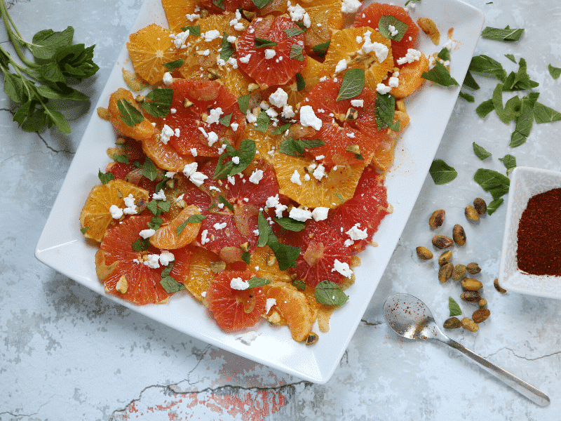 Serve citrus rounds on a platter and garnish with mint leaves, crumbled goat cheese, and pistachios.