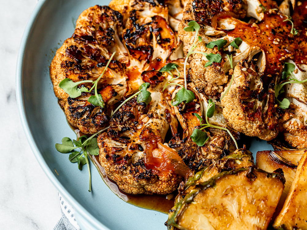 Pre-heat oven to 350 F. Heat a grill or a grill pan until hot and lightly brush with vegetable oil. Place the marinated cauliflower onto the grill/pan and cook for about 5-7 minutes on each side. Allow the steaks to cook undisturbed on the grill so nice grill marks are formed. Flip and cook on the other side. Repeat with all the steaks.