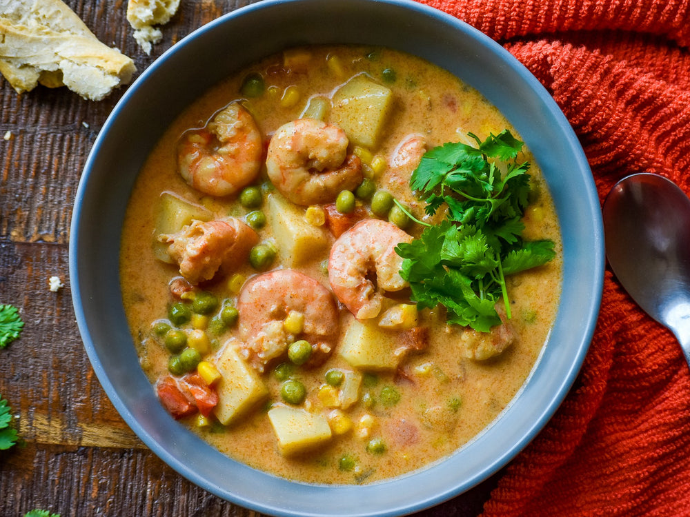 Peruvian Shrimp Chowder (Chupe de Camarones in Spanish) is a delightfully creamy and briny seafood stew. Like many other soups in Peruvian cuisine, it is boldly flavored and a staple on many home and restaurant menus. Soups and stews in general are a fantastic way to use healthy, local ingredients and an economical way to feed large families. This popular shrimp soup originated in the coastal city of Lima, the capital of Peru, where fresh seafood is prized by locals. It is traditionally seasoned with aji peppers, a spicy, flavorful Peruvian chili pepper used as a staple across Peruvian cuisine. Our chefs have included Piquant Post Aji Amarillo spice as an optional ingredient to add a fruity and fiery kick.