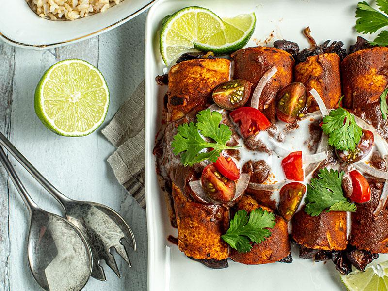 Mole (pronounced 'MOLE-lay') sauce is a complex and fragrantly spiced Mexican sauce traditionally made from braising chilis, aromatics (like onion and garlic), spices, nuts, seeds, dried fruit, and chocolate to form an incredibly rich sauce. In this vegan Portobello Mole Enchiladas recipe, our chefs develop a delicious sauce using our Mexican Mole spice blend, so you can whip together a stupendous dish in a fraction of the time! Mushrooms are oven roasted, turning beautifully tender and meaty in texture. The rich sauce displays depth of flavor with complex spices, notes of cocoa, savory tomato, and aromatic garlic and onion. The sauce is used to coat and soften tortillas then top the finished enchiladas!