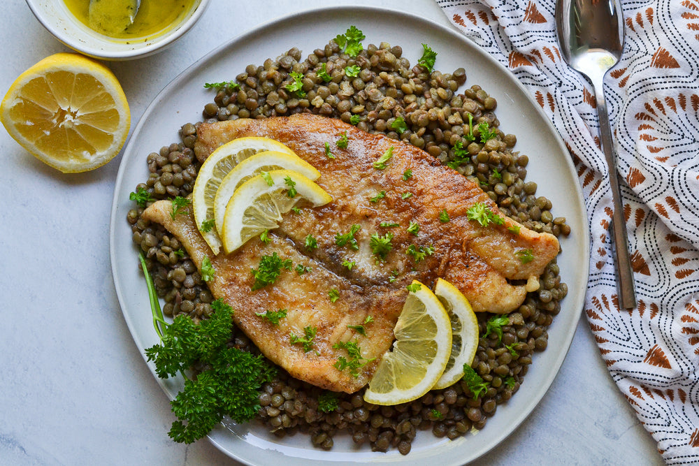 Serve fish filets over lentils, and drizzle with brown butter and lemon sauce. Garnish with lemon and parsley.