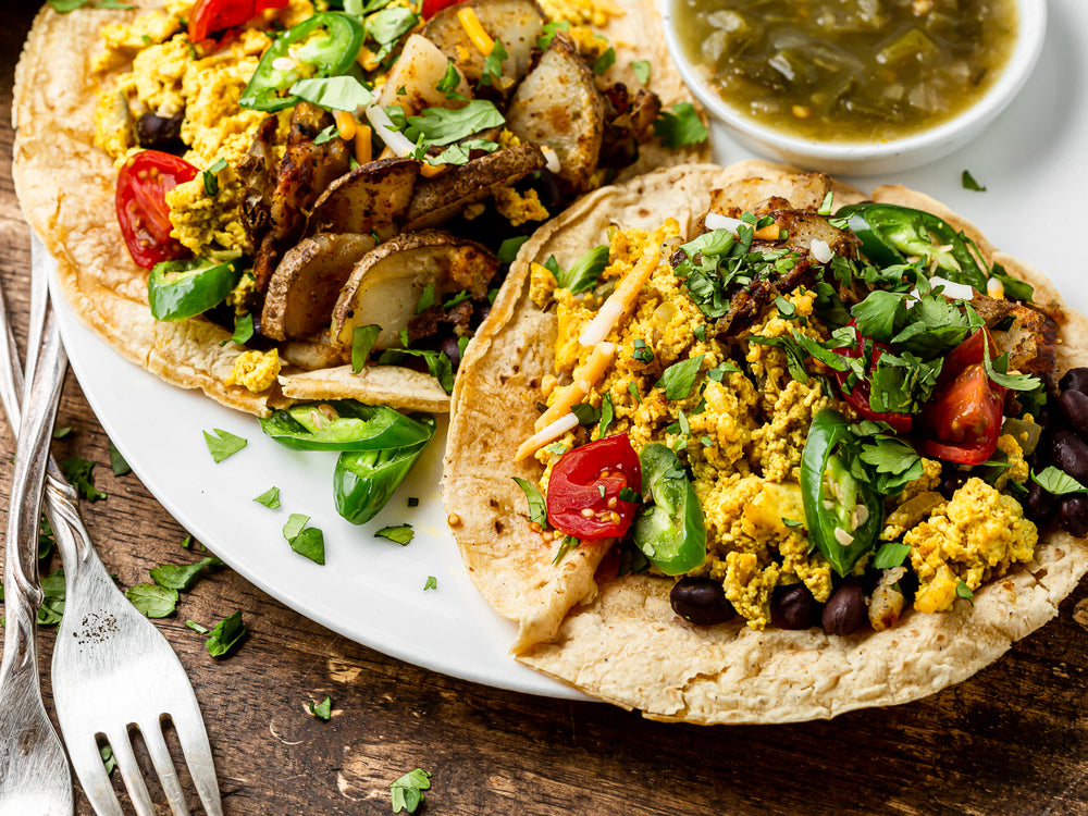 Huevos Rancheros, which translates to “Rancher’s Eggs”, is a traditional Mexican breakfast of eggs served with tortillas, refried beans, fresh salsa, cilantro, and a dusting of Mexican cheese like cotija cheese. In our hearty, vegan Huevos Rancheros, you’ll find maximum flavor with plant-based ingredients. Scrambled tofu “eggs” replace the traditional fried eggs and pairs beautifully with bites of crispy fried potatoes and tender black beans.