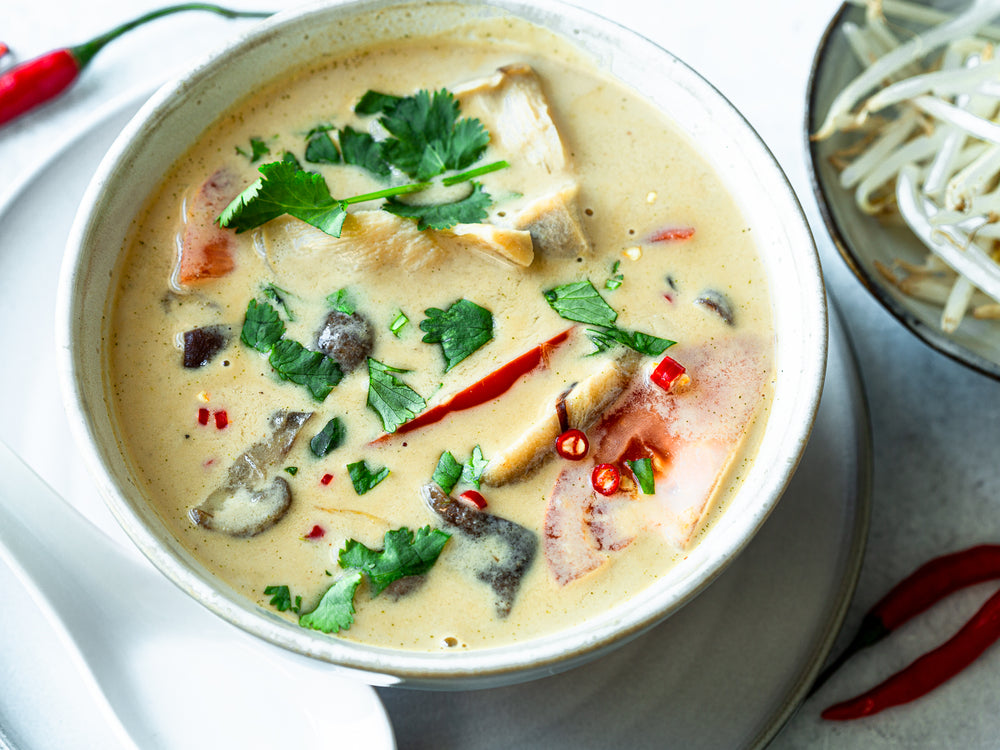If you are looking for a hearty vegan soup recipe to add to your rotation, we have a perfect choice. Tom Kha Gai, or Thai coconut chicken soup, is a spicy and sour hot soup with a coconut milk broth brewed with Galangal root and chicken. Galangal root is not easy to find in North America, but if you find some, be sure to add a few slices to the broth as it cooks. Our broth isn't as spicy as another popular Thai soup called Tom Yum, and this dish has a hint of sweetness to it to make each spoonful of broth a comforting and aromatic joy.