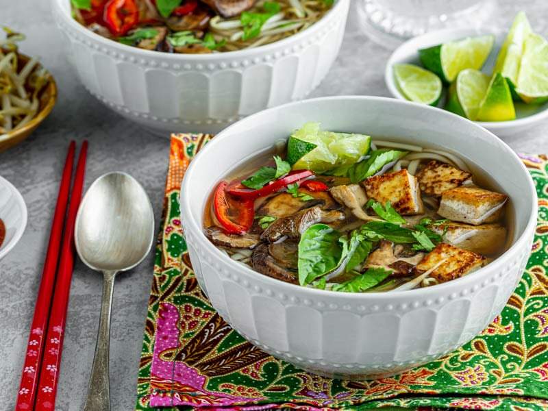 In this vegan tofu mushroom pho recipe, crisp tofu and tender sautéed mushrooms are balanced by abundant fresh herbs, zesty lime and a hint of spice. This is a fun, quick and delicious version of your favorite restaurant’s pho, satisfying your Pho craving without leaving your kitchen.