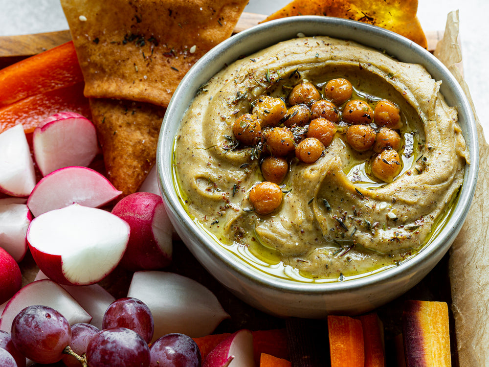 Transfer the hummus to a serving bowl and garnish with whole chickpeas, a little more zaatar and a drizzle of olive oil. Serve on a platter with pita, and sliced fruits and vegetables such as carrots, cucumbers, bell pepper, radishes, and grapes.