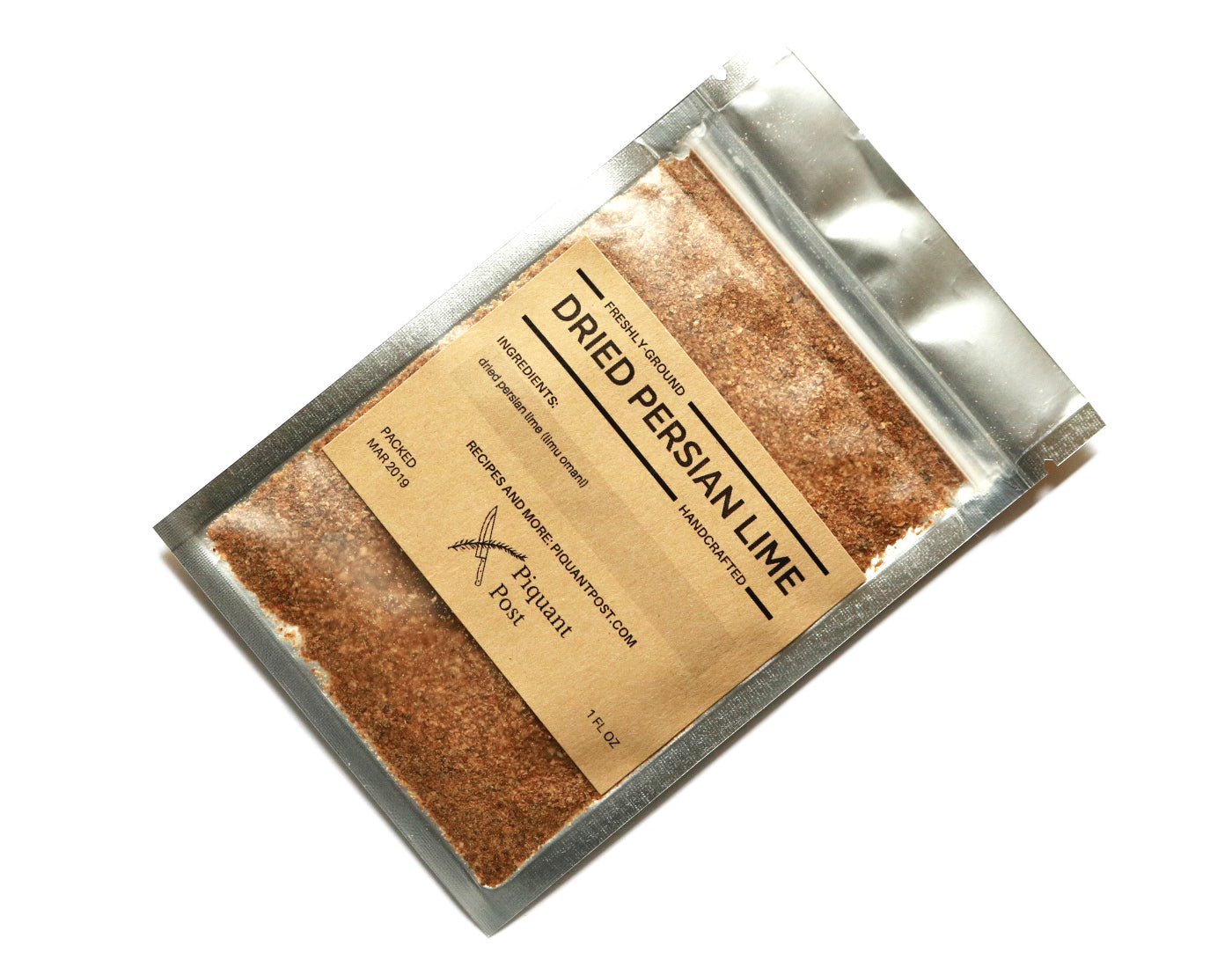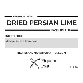 Dried Persian Lime (also known as Limu Omani in Farsi) is an essential spice in Persian cuisine. Made from lemons or small limes that are boiled in salt water and dried until rock hard, dried Persian lime is powerfully fragrant of concentrated citrus when crushed or ground. They imbue dishes with a more complex flavor than lemon or lime peel or juice and thus are prized in making stews. While immensely popular in the Middle East, dried Persian lime is not yet mainstream in North America except with serious spice hunters and in-the-know chefs (and now, Piquant Post customers!). Sprinkle in soups, stews, casseroles, or add to meats, fish, and even over on salads.