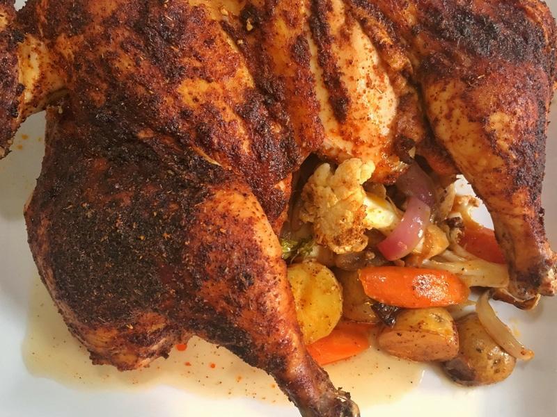 In a small bowl, combine marinade ingredients. Generously brush inside of chicken. Place chicken skin side up on top of the veggies, tucking the wing tips. Finish by brushing skin side generously with remaining marinade.