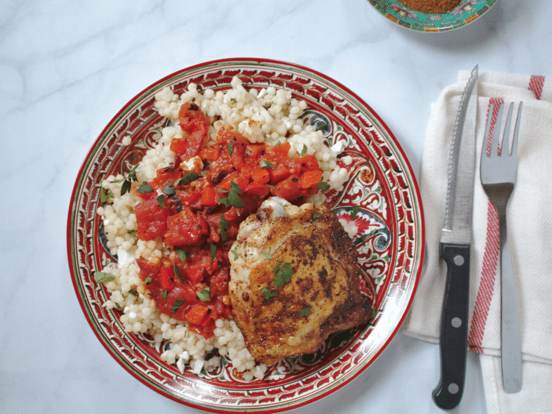 This recipe for Lebanese baharat chicken with tomato and couscous recipe has multiple steps in ingredients. But, by following our recipe steps you can keep organized and cook the entire meal in under 30 minutes.