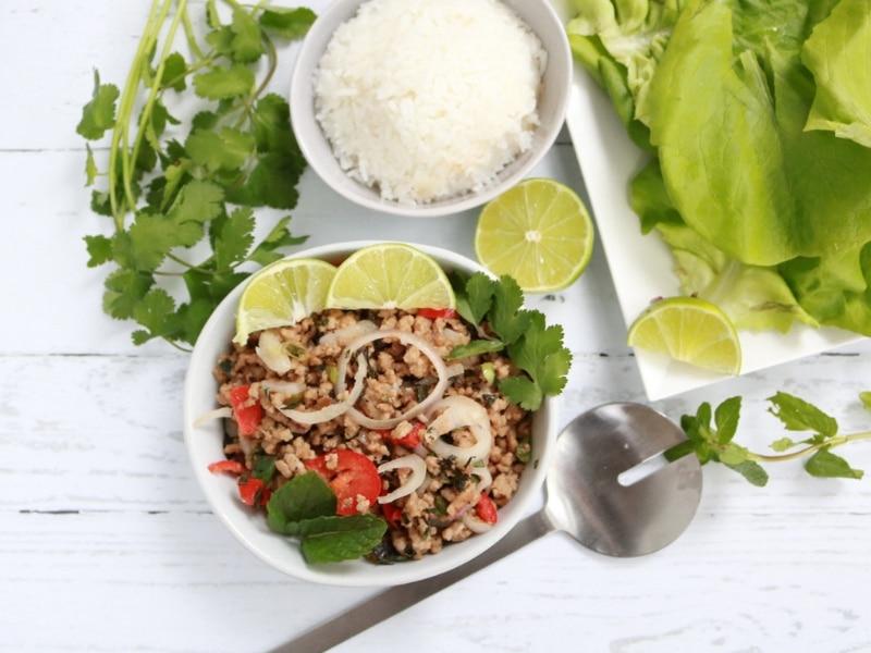We like to serve this dish family style: Place the Larb meat filling in a large bowl and pile the lettuce leaves, fresh herbs, and lime wedges on a separate plate or platter to pass around. Fill your lettuce and eat like a wrap!