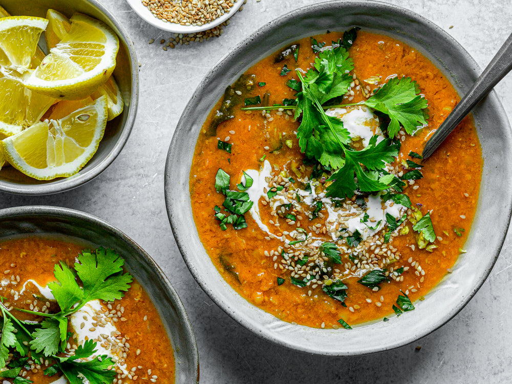Moroccan food consistently rates as one of the world's most popular cuisines, not least because the food borrows and remixes flavors and ingredients from Arabic, African, and Mediterranean cultures. Set on the coast on one of the busiest historical trading routes, Morocco and its merchants were well-positioned for centuries to trade the spices coming from far-flung ports to Europe. This recipe for a Moroccan-style red lentil soup is inspired by a traditional soup called 'Harira'. Our version is vegan and gluten-free, yet hearty and easy enough to make on a busy weeknight. Customize with your favorite ingredients, from shredded chicken to pumpkin seeds to dried fruit.